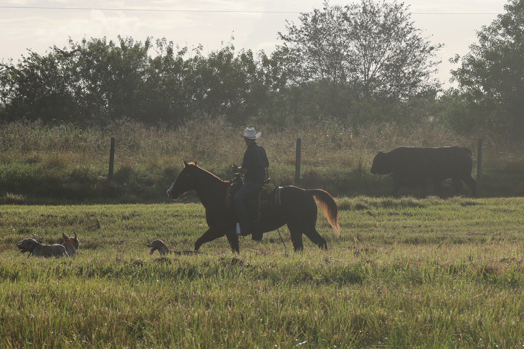 Our cows are raised on an abundance of pasture and allowed to move freely about it, grazing and lounging where they please. They typically hang out in herds, either grazing or cooling down in a pond or the shade of a nearby palm or pine. When it comes time for check-ups, our cowboys herd them up on horseback and lead them slowly to the corrals. They never receive antibiotics or hormones. And frankly, they don't need them. We pride ourselves on raising healthy animals and we align our ranching practices to do so.